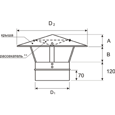 Флюгарок круглого сечения из оцинкованной стали. Защищает канал от атмосферных воздействий, а также способствует увеличению тяги в системе. Стакан сделан в виде хомута, что упрощает установку.